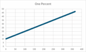 The point the one percent rule is trying to make is that small changes stack up over time. In this case the supposition, as preached, is that if you improve by one percent every day for a year, then at the end of the year you will have improved by 36.5% – which is the simple math of point-oh-one times 365.